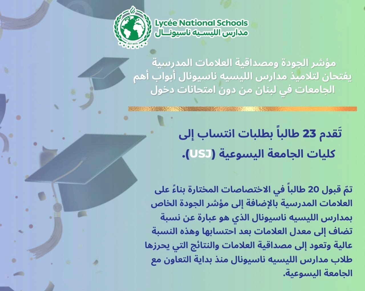 مؤشر الجودة ومصداقية العلامات المدرسية يفتحان لتلاميذ مدارس الليسيه ناسيونال أبواب أهم الجامعات في لبنان من دون امتحانات دخول