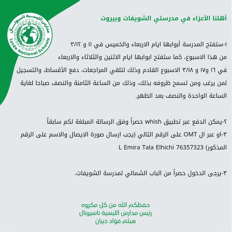 بدء التسجيل والتثبيت للقدامى 2026-2027 لمدرستي الشويفات وبيروت